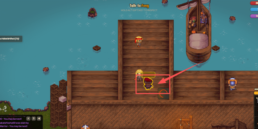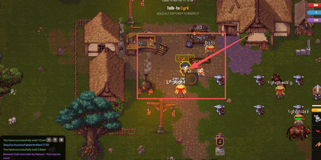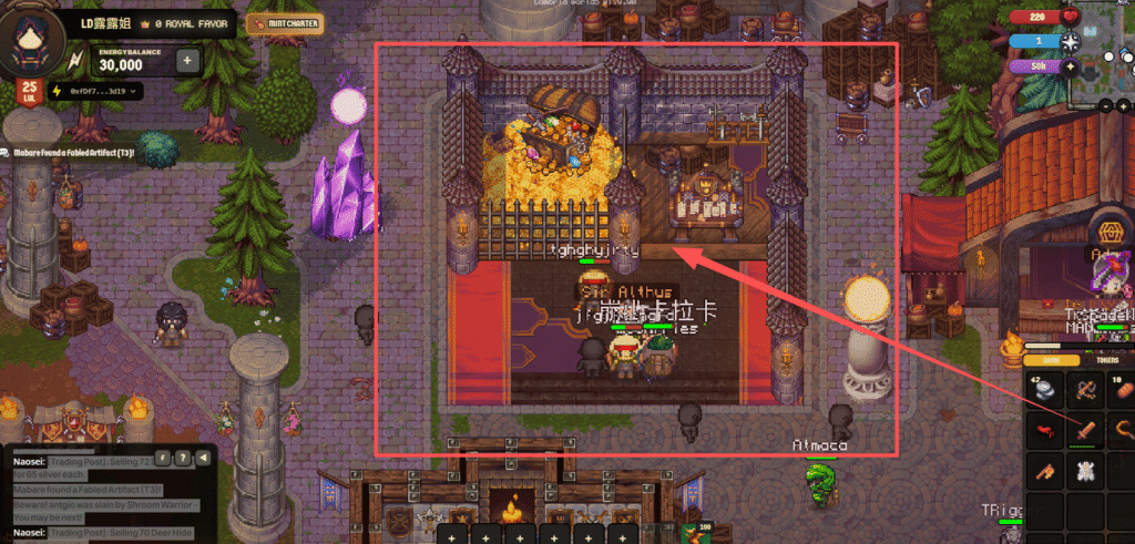 详细攻略: -穿装备 传送到主城后,按5打开背包,装上第一行第一格的武器铜剑(Bronze Sword),并把背包里的10个面包托到物品栏第一格,血量危险时按Q吃面包回血 -升级 走到的下图黄色升级区,杀小动物升级(牛、羊、猪、鸡都有经验)。点击2打开人物面板,达到40级(面板前4项属性达到35)即可停手 -打怪 选择路线出城打开,路线一、路线二皆可,根据人数多少自行选择。我们的目标是三种40+等级的怪,它们掉落遗物的概率很高,怪的样子见下图右上 绝大多数情况下,三只怪内是必掉遗物的遗物是一个红色小骷髅的样子,很显眼,拾取后会弹出一个对话框 -交材料 打出遗物后,按B回城,按下图黄色路线,找到NPC Althus上交面具,任务完成。回到Abs钱包页面,刷新领取徽章